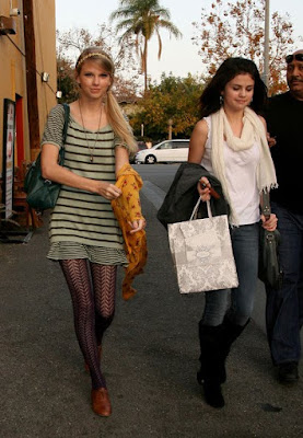 Taylor Swift snapped out at a restaurant in LA with Selena Gomez on December 2.While Selena kept it fresh in a crisp white top paired with blue jeans, Taylor went for pretty and colorful prints, mixing a striped mini dress with crochet tights, her flat brogues, green French Connection bag and a yellow floral scarf.